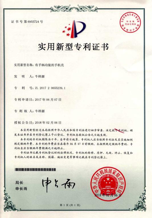 近日,从国家知识产权局获悉,正规滚球app平台官网2014级机械设计制造及其自动化专业牛梓源同学设计发明的《有手柄功能的手机壳》获批国家实用新型专利证书(专利号:ZL201720655239.1)。