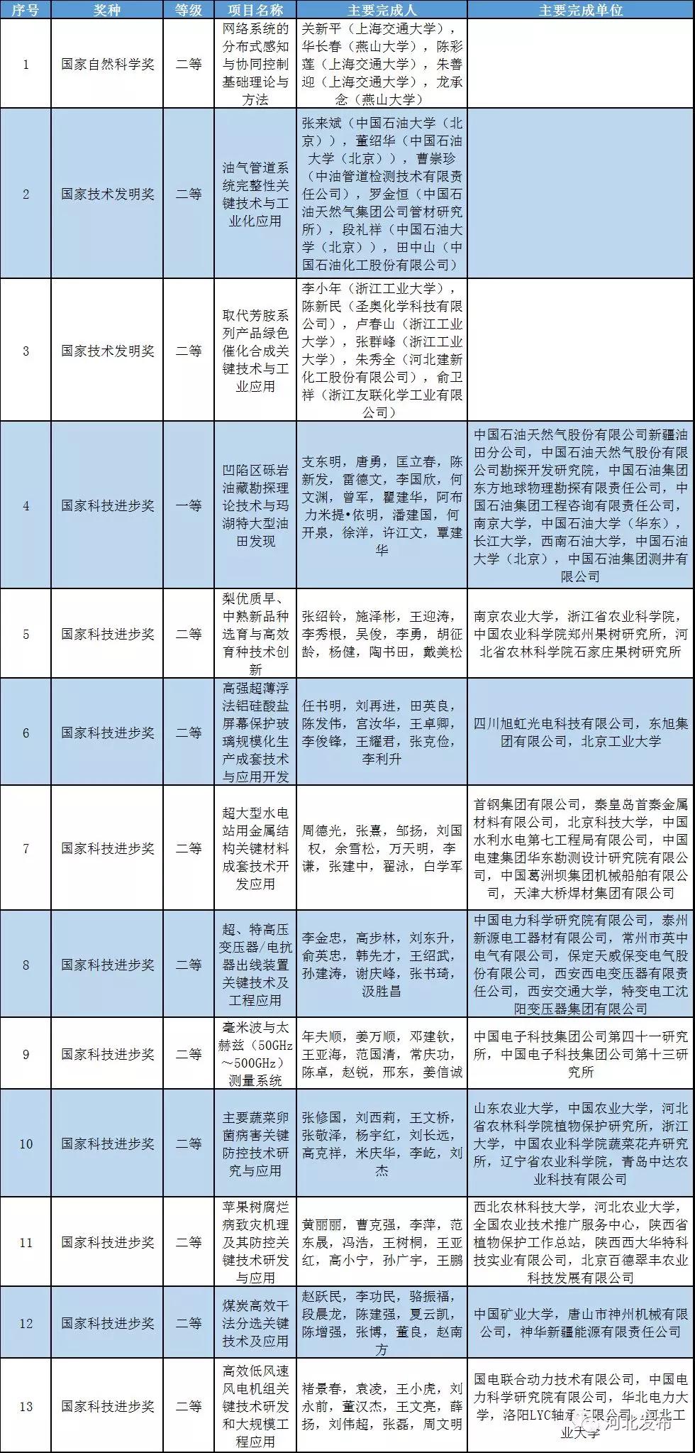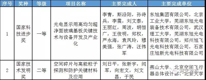 根据《国家科学技术奖励条例》的规定,经国家科学技术奖励评审委员会评审、国家科学技术奖励委员会审定和科技部审核,国务院批准并报请国家主席习近平签署,授予刘永坦院士、钱七虎院士国家最高科学技术奖;国务院批准,授予“量子反常霍尔效应的实验发现”国家自然科学奖一等奖,授予“黄瓜基因组和重要农艺性状基因研究”等37项成果国家自然科学奖二等奖,授予“云-端融合系统的资源反射机制及高效互操作技术”等4项成果国家技术发明奖一等奖,授予“小麦与冰草属间远缘杂交技术及其新种质创制”等63项成果国家技术发明奖二等奖,授予“水下发射固体运载火箭系统研制”等2项成果国家科学技术进步奖特等奖,授予“凹陷区砾岩油藏勘探理论技术与玛湖特大型油田发现”等23项成果国家科学技术进步奖一等奖,授予“主要蔬菜卵菌病害关键防控技术研究与应用”等148项成果国家科学技术进步奖二等奖,授予简·迪安·米勒教授等5名外国专家中华人民共和国国际科学技术合作奖。河北省共有15项通用项目获奖,其中,“光电显示用高均匀超净面玻璃基板关键技术与设备开发及产业化”项目获国家科技进步奖一等奖,这也是由我省主持研发的通用项目首获该奖项。此外,河北省另有1项参与研发项目获国家科技进步奖一等奖,并摘得9项国家科技进步奖二等奖、1项国家自然科学奖二等奖、3项国家技术发明二等奖。