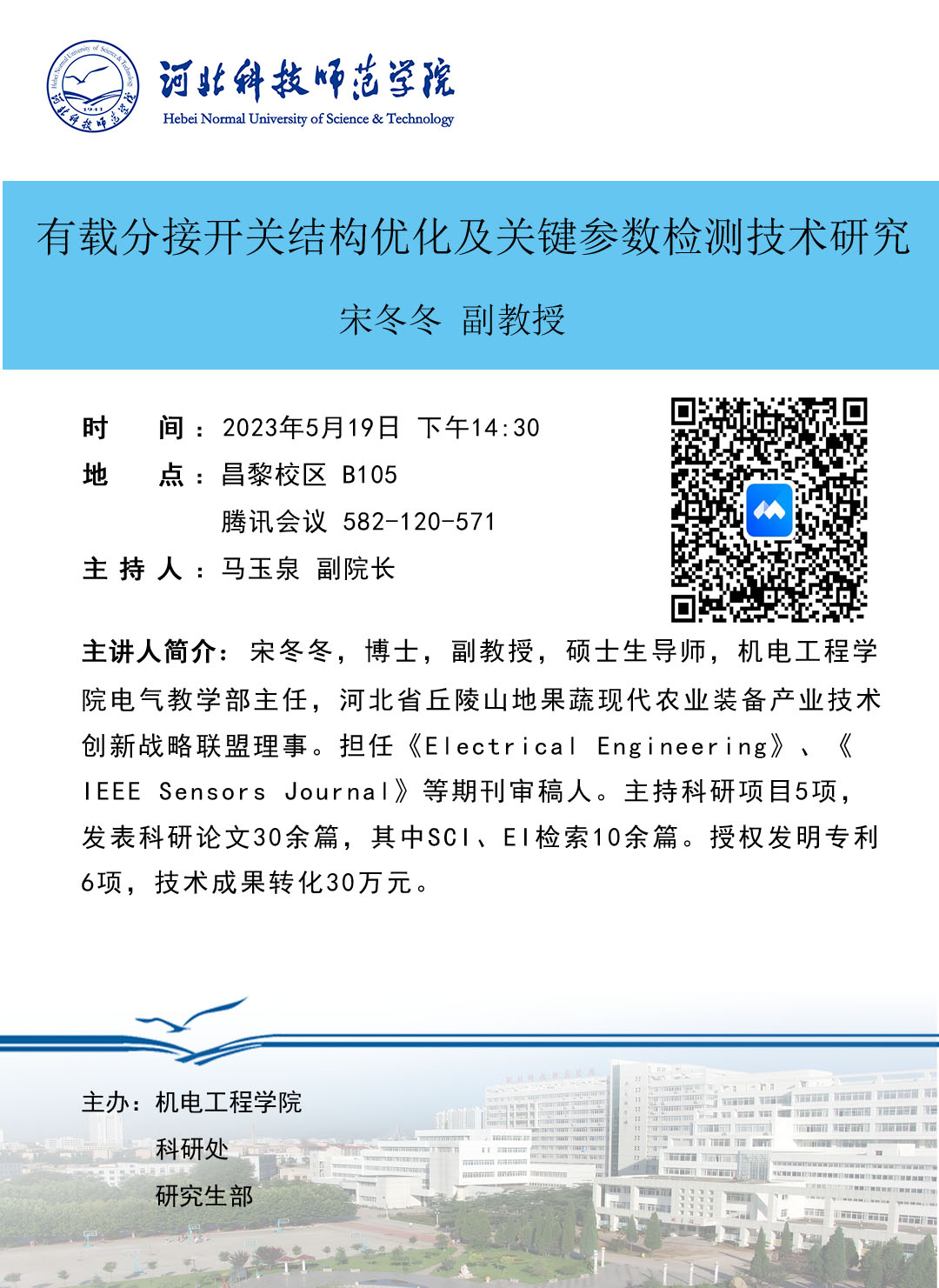 主讲人介绍:宋冬冬,博士,副教授,硕士生导师,正规滚球app平台官网电气教学部主任,河北省丘陵山地果蔬现代农业装备产业技术创新战略联盟理事。担任《Electrical Engineering》、《IEEE Sensors Journal》等期刊审稿人。主持科研项目5项,发表科研论文30余篇,其中SCI、EI检索10余篇。授权发明专利6项,技术成果转化30万元。