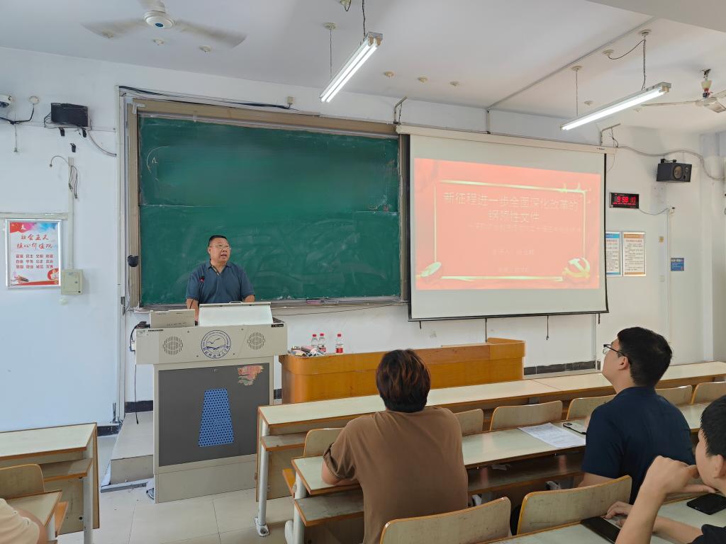 学院党委负责人以《新征程进一步全面深化改革的纲领性文件—深刻领会和把握党的二十届三中全会精神》为题,从全面深化改革的重大意义、指导思想、总目标、重大原则、重大举措、根本保证六大方面对《中共中央关于进一步全面深化改革、推进中国式现代化的决定》及习近平总书记就《决定(讨论稿)》所作的说明进行了解读。