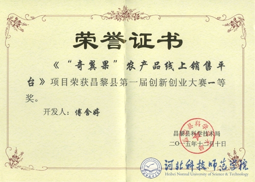 近日, 在昌黎县第一届创新创业大赛中,我院2013级电气专业傅含婷同学开发的《“奇翼果”农产品线上销售平台》创业项目荣获一等奖,奖金1000元;2013级电子专业齐卓同学开发的《广告wifi》等三个创业项目荣获二等奖,奖金共1500元;2013级电气专业葛攀同学开发的《魔方机器人》等五个创业项目荣获三等奖,奖金共1500元。