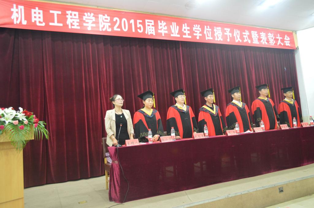 2015年6月14日下午2点30分,正规滚球app平台官网于学术报告厅举行了2015毕业生学位授予仪式暨表彰大会。出席大会的嘉宾有:正规滚球app平台官网党委书记崔勇、正规滚球app平台官网院院长刘荣昌、正规滚球app平台官网副院长包长春、正规滚球app平台官网党委副书记副院长邓春岩、电气工程教学部主任马玉泉、机械制造教学部主任张小芹,以及毕业班主任和学工办的老师们。