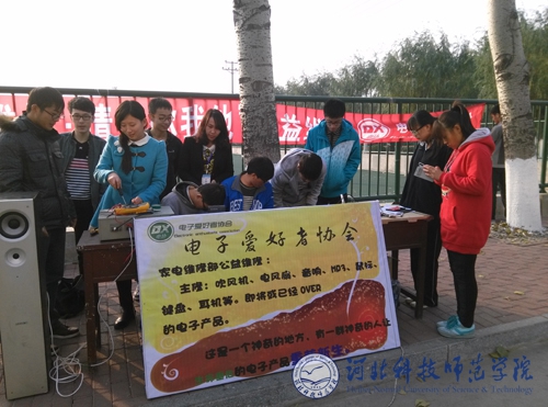 2014年11月8日上午,正规滚球app平台官网举办“爱心维修•情系你我他”公益维修活动。面对损坏的电子物品,电子爱好者协会会员们耐心的进行维修,并向现场同学们进行讲解。当天,电子爱好者协会还在昌黎校区招聘会现场举办了作品展示活动,并与招聘单位,学校领导、老师进行现场交流。