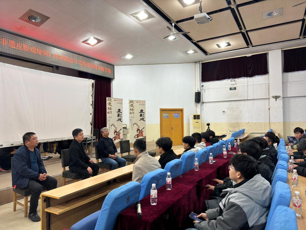 演出在灯光璀璨的舞台上拉开帷幕,皮影艺人们以其精湛的技艺和深厚的艺术功底,将一幕幕经典故事娓娓道来。首场剧目《牛郎织女》以其凄美的爱情故事,让观众感受到了传统皮影戏独特的艺术魅力与情感张力。《武家坡》以其生动的戏剧冲突与人物塑造,展现了皮影戏在叙事与表演上的高超技艺。《武松打虎》则以其惊险刺激的情节与逼真的动作表现,赢得了现场观众的阵阵掌声与喝彩。压轴剧目《火焰山》以其宏大的场景设计与奇幻的视觉效果,将整场演出推向了高潮,为观众带来了一场视觉与心灵的双重盛宴。演出结束后,非遗传承人与同学们深入讨论了昌黎非物质文化遗产的传承与创新,国家级非物质文化传承人刘立新老师希望同学们能够热爱中国传统文化,积极参与到保护昌黎非物质文化遗产的工作中。